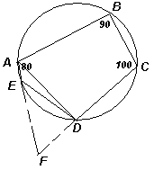 Пусть АВСDE – данный пятиугольник, в котором углы А, В, С, D и Е соответственно равны 80°, 90°, 100°, 130° и 140° (см. рис.). Далее можно рассуждать по-разному. Первый способ. Проведём диагональ AD, тогда четырёхугольник АВСD также вписанный, поэтому ∠BAD = 180° – ∠BСD = 80°. Таким образом,