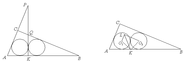 Достаточно доказать, что середина K отрезка MN равноудалена от катетов AC и BC треугольника ABC. Первый способ. Пусть общая касательная к двум окружностям, проведённая через точку K, пересекает прямые AC и BC, в точках P и Q соответственно (рис. слева). Прямоугольные треугольники AKP и QKB очевидно подобны, а так как их вписанные окружности равны, то и эти треугольники равны. Значит, равны и их высоты, опущенные из общей вершины K, то есть расстояния от K до прямых AC и BC.