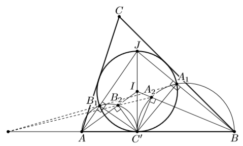 Пусть I – центр вписанной окружности ω, а J – её точка, диаметрально противоположная C' (см. рис.). Поскольку углы AB1C', C'B1J, BA1C', C'A1J – прямые, точки A1 и B1 – это точки пересечения AJ и BJ с ω. Точки же A2 и B2 – это основания перпендикуляров, опущенных из C' на прямые BI и AI соответственно.