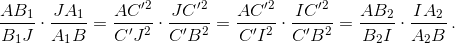 Согласнотеореме Менелая, применённой к треугольникамAIB иAJB, это означает, что прямыеA1B1 иA2B2 пересекаютAB в одной точке (или обе параллельны ей).