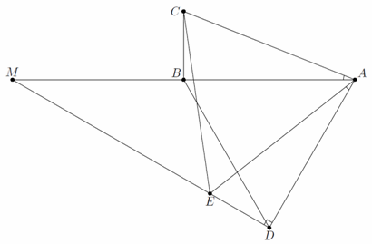 Дан прямоугольный треугольник ABC. На катете AB во внешнюю сторону построен равносторонний треугольник ADB, а на гипотенузе AC во внутреннюю сторону – равносторонний треугольник AEC. Прямые DE и AB пересекаются в точке M. Весь чертёж стерли, оставив только точки A и B. Восстановите точку M.