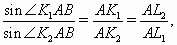 Так как ∠K1AB = ∠AK2B, ∠K2AB = ∠AK1B, треугольники AK1B и K2AB подобны (см. рис.). Применяя к ним теорему синусов, получаем: