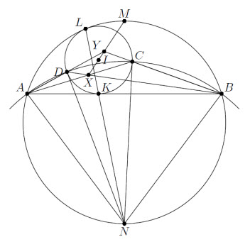 Пусть K, L – точки касания ω с прямой AB и большой окружностью. Так как L – центр гомотетии окружностей, а касательные к ним в точках K и N параллельны, точки L, K, N лежат на одной прямой. При этом ∠KAN = ∠NLA (эти углы опираются на равные дуги). Значит, треугольники KAN и ALN подобны и AN² = NK·NL = NC², то есть четырёхугольник ABCD вписан в окружность с центром N (см. рис.). Относительно этой окружности прямая XY является полярой точки пересечения AB и CD. При этом, поскольку ∠NAM = ∠NBM = 90° = ∠NCI = ∠NDI, точки M и I являются полюсами прямых AB и CD и, следовательно, лежат на XY.