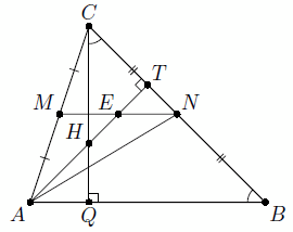 Пусть Н – ортоцентр треугольника АВС. Тогда высота АТ треугольника АВС содержит медиану треугольника AMN, то есть пересекает отрезок MN в его середине – точке Е. Далее можно рассуждать по-разному. Первый способ. Треугольники ЕТN и АТВ подобны (рис. слева), следовательно, TN : TB = TE : TA = EN : AB = 1 : 4. Следовательно, СТ = ½ BT.