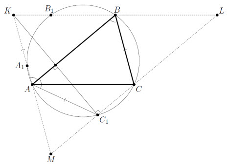 Решение 2:Пусть K, L и M – точки попарного пересечения прямых AA1, BB1и CC1 (см. рис.).