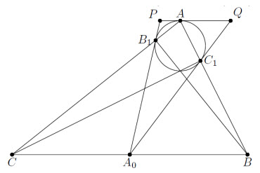 ∠PB1A = ∠CB1A0 = ∠B1CA0 = ∠PAC, и, значит, PA = PB1 (рис. слева). Аналогично QA = QC1. Следовательно, вписанная окружность треугольника A0PQ касается его сторон в точках A, B1, C1, откуда и следует утверждение задачи.