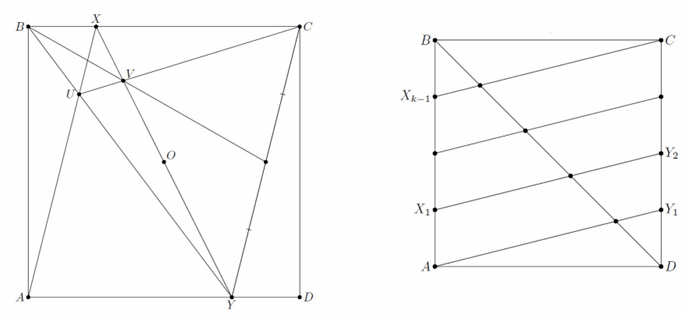 Сначала разделим сторону пополам. Проведя диагонали, найдём центр O квадрата ABCD. Теперь пусть X – точка на стороне BC, Y – точка пересечения XO и AD, U – точка пересечения AX и BY, V – точка пересечения прямых UC и XY (рис. слева). Тогда прямая BV делит основания трапеции CYUX пополам. Соединив O с серединой CY, разделим пополам стороны AB и CD.