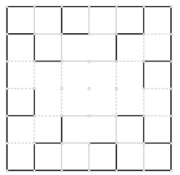 Искомая развертка изображена на рисунке. Жирные линии обозначают разрезы, тонкие и пунктирные — сгибы вверх и вниз. Центральный квадрат 2×2 соответствует горизонтальной перегородке куба.