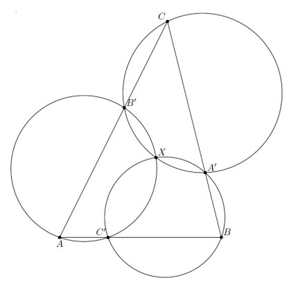 Пусть Y – отличная от C' точка пересечения окружностей AB'C' и BC'A'. Тогда, так как ∠B'YC' = 180° – ∠BAC и ∠C'YA' = 180° – ∠CBA, то