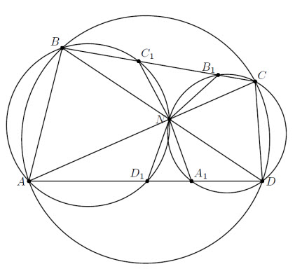 Диагонали вписанного четырёхугольника ABCD пересекаются в точке N. Описанные окружности треугольников ANB и CND повторно пересекают стороны BC и AD в точках A1, B1, C1, D1. Докажите, что четырёхугольник A1B1C1D1 вписан в окружность с центром N.