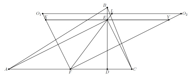 На высоте BD треугольника ABC взята такая точка E, что ∠AEC = 90°. Точки O1 и O2 – центры описанных окружностей треугольников AEB и CEB; F, L – середины отрезков AC и O1O2. Докажите, что точки L, E, F лежат на одной прямой.
