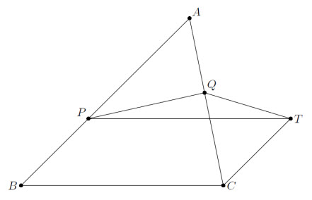 Если AB = AC, то утверждение очевидно. Пусть AB > AC, тогда ∠C > ∠B, то есть точка Q находится дальше от прямой BC, чем точка P. Построим параллелограмм CBPT. Тогда CT = BP = CQ (см. рис.). Следовательно, ∠PQT > ∠TQC = ∠QTC > ∠QTP, то есть BC = PT > PQ.