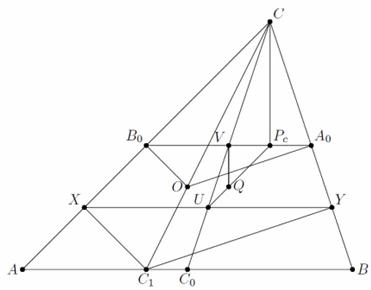 VQ : CPc = UV : UC = C1O : CC1, откуда VQ = ½ OC0 и Q – центр описанной окружности треугольника A0B0C0, то есть окружности девяти точек.