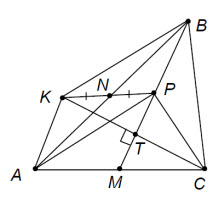 Решение 1:Построим параллелограмм AKBP. Его диагонали делятся точкой пересечения пополам, то есть пересекаются в точке N и PK = 2PN = PC. Пусть прямые MB и CK пересекаются в точке T. Поскольку MT || AK, то MT – средняя линия треугольника AKC, откуда KT = TC. Значит, PT – медиана, проведённая к основанию равнобедренного треугольника KPC, откуда PT ⊥ CK. Следовательно, BT – медиана и высота треугольника BKC, значит, AP = BK = BC.