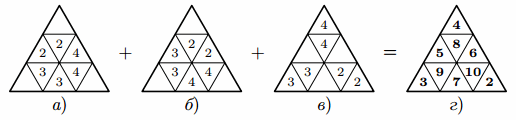 Правильный треугольник со стороной 3 разбит на девять треугольных клеток, как показано на рисунке. В этих клетках изначально записаны нули. За один ход можно выбрать два числа, находящиеся в соседних по стороне клетках, и либо прибавить к обоим по единице, либо вычесть из обоих по единице. Петя хочет сделать несколько ходов так, чтобы после этого в клетках оказались записаны в некотором порядке последовательные натуральные числа n, n + 1, ..., n + 8. При каких n он сможет это сделать?