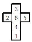Первый способ. Заметим, что в указанной развёртке противоположными гранями являются крайние по горизонтали, а также первая и третья сверху по вертикали. Поэтому, независимо от расположения чисел на развёртке, разностью между суммами по вертикали и по горизонтали является число, записанное в нижнем квадрате. Следовательно, Васе надо разрезать кубик так, чтобы в этом квадрате была записана цифра 1. В этом случае на пересечении полос будет цифра 6, одна из пар (2, 5) и (3, 4) окажется на горизонтали, а другая – на вертикали, например так, как показано на рисунке.