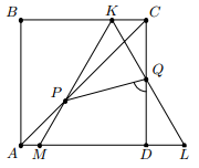 Квадрат ABCD и равносторонний треугольник MKL расположены так, как это показано на рисунке. Найдите угол PQD.
