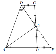 Заметим, что ∠AED = 90° (сумма углов A и D равна 180°, DE и AE – биссектрисы, см. рис. слева). Пусть F – точка пересечения прямых DE и AB. В треугольнике ADF отрезок AE является высотой и биссектрисой, следовательно, этот треугольник – равнобедренный и DE = EF. Поэтому треугольники DCE и FBE равны по стороне и двум углам. Следовательно, CE = BE и DC = FB, откуда AD – CD = AF – CD = AB.