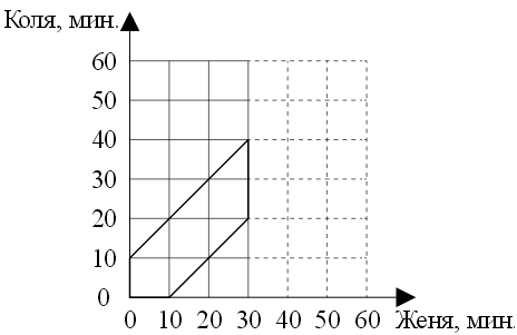 а) Изобразим графически времена прихода. Время прихода Жени будем откладывать по оси Х, а время прихода Коли – по оси Y.