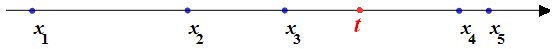 а) Введём координатную прямую, на которой расположим дома с координатами x1, x2, x3, x4, x5 упорядоченными по возрастанию. Пусть t – координата почтового отделения на числовой прямой.