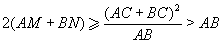 По теореме об угле между касательной и хордой ∠ACM = ∠CBA и ∠BCN = ∠CAB. Поскольку угол ACB тупой, точки A, M, N, B лежат на прямой AB именно в таком порядке. По теореме о касательной и секущей AM = AC²/AB и BN = BC²/AB. Применив сначала неравенство Коши, а затем неравенство треугольника, получаем, что