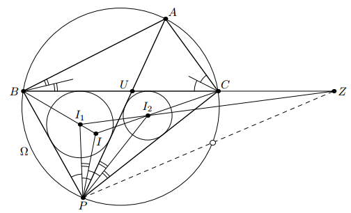 Дан фиксированный треугольник ABC. По его описанной окружности движется точка P так, что хорды BC и AP пересекаются. Прямая AP разрезает треугольник BPC на два меньших, центры вписанных окружностей которых обозначим через I1 и I2 соответственно. Прямая I1I2 пересекает прямую BC в точке Z. Докажите, что все прямые ZP проходят через фиксированную точку.