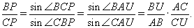 Применяя теорему синусов к треугольникам BPC, ABU и ACU, имеем