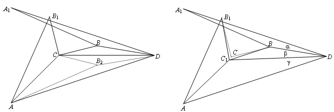 Отметим на плоскости точки A(0, 0), A1(0, 10), B(9, 6), B1(4, 9), C(5, 5), D(15, 5) и B2(9, 4) (рис. слева). Нетрудно убедиться, что точки B1 и B2 симметричны относительно AC, а точки B2 и B, а также A и A1 – относительно CD. Поэтому фигура, составленная из треугольников AB1C, ACD, CBD и BA1D, представляет собой развёртку вырожденного тетраэдра ACDB2 (он вырожден потому, что ∠A1DB + ∠BDC = ∠CDA).