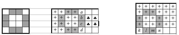 Сначала заполним плюсами левый верхний квадрат 4×4 (рис. в центре) – по предположению это можно сделать. Покажем, как продолжить это заполнение на четыре клетки справа от квадрата (a, b, c, d на рис. справа).