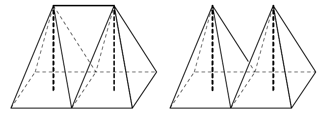 На землю положили квадратную раму, в центре квадрата установили вертикальный шест. Когда на эту конструкцию сверху натянули ткань, получилась маленькая палатка. Если положить рядом вплотную две таких же рамы, в центре каждой поставить вертикальный шест той же длины и натянуть сверху ткань, получится большая палатка. На маленькую палатку ушло 4 квадратных метра ткани. А сколько ткани потребуется для большой палатки?
