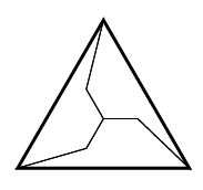 Разрезание на 3 части. Разрежем правильный треугольник на три равных пятиугольника (см. рис.). Пятиугольники равны, так как совмещаются поворотом на 120°. Если взять такую картинку в основании тетраэдра и соединить оставшуюся вершину тетраэдра с каждой из вершин пятиугольников, то получится разрезание тетраэдра на три равных шестигранника (каждый из которых является невыпуклой пирамидой).