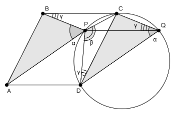 Построим параллелограмм BCQP (см. рис.). ∠DCQ = ∠АВP (углы с сонаправленными сторонами). Значит, равны треугольники CDQ и BAP. Следовательно, ∠CPD + ∠DQC = ∠CPD + ∠АРВ = 180°, то есть четырёхугольник CPDQ – вписанный.