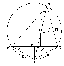 СI = CB = CD = 2. Далее можно рассуждать по-разному. Первый способ. Пусть K и N – основания перпендикуляров, опущенных из точек C и I на BD и AD соответственно (рис. слева), тогда из равенства прямоугольных треугольников BKC и ANI следует, что CK = IN. Перпендикуляр IP к диагонали BD также равен IN (это радиусы вписанной окружности треугольника ABD), поэтому BD пересекает отрезок CI в его середине L. Таким образом, CL = IL = 1.