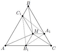 Отметим на стороне AB точку C1, на стороне BC точку A1, а на стороне AC точку B1 таким образом, что MC1 || BC, MA1 || AC, MB1 || AB (см. рис.). Тогда отрезки MA1, MB1 и MC1 разобьют данный треугольник на три трапеции. Из параллельности следует, что каждый угол при большем основании этих трапеций равен 60°, поэтому эти трапеции равнобокие. Следовательно, в каждой трапеции диагонали равны: B1C1 = MA, A1C1 = MB, A1B1 = MC.