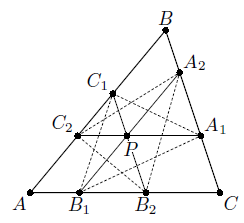 Заметим, что SA2B2C2 = SA2C2P + SB2C2P + SA2B2P, а SA1B1C1 = SA1C1P + SB1C1P + SA1B1P. Докажем, что SA2C2P = SA1C1P (для других пар площадей равенство доказывается аналогично). Это можно доказать различными способами. Первый способ. Поскольку C2PA2B – трапеция, то SA2C2P = SBA2P. Так как BC1PA2 – параллелограмм, то SBA2P = SBC1P. И, наконец, из того, что BC1PA1 – трапеция, получим, что SBC1P = SA1C1P . Следовательно, SA2C2P = SA1C1P.