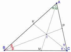 Рассмотрим пирог в виде треугольника АВС, в котором проведены биссектрисы АМ, ВР и СK. Пусть I – точка их пересечения, а углы обозначены так, как показано на рис.