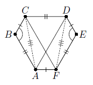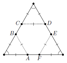 Рассмотрим шестиугольник ABCDEF с равными углами, у которого стороны равны через одну, а соседние – не равны. Построить его можно, отрезав от равностороннего треугольника, три меньших равных равносторонних треугольника (рис. слева). В нём противолежащие стороны параллельны.