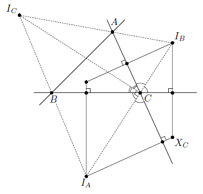 Так как центры вневписанных окружностей равноудалены от прямых, содержащих стороны треугольника, то прямая IAXC симметрична прямой, проходящей через IA и перпендикулярной BC, относительно прямой IAIB. Аналогично рассматривается симметрия прямой IBXC относительно прямой IAIB. Следовательно, точка XC симметрична точке пересечения перпендикуляров к сторонам BC и AC треугольника, проведённых из точек IA и IB соответственно, относительно прямой IAIB. Аналогично можно определить точки XA и XB.