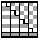 Пример. Проведём в нашей таблице диагональ из верхнего левого угла в нижний правый. Все клетки, лежащие на или ниже диагонали, покрасим в чёрный цвет, если они лежат в чётных строках, и в белый – если в нечётных (раскраска "по строкам"). Все клетки, лежащие выше диагонали, покрасим в чёрный цвет, если сумма номеров их строки и столбца чётна, и в белый – если нечётна ("шахматная" раскраска). Пример такой раскраски для таблицы 8×8 показан на рисунке. Нетрудно проверить, что в каждом столбце ровно по 50 чёрных клеток, в 2n-й строке есть 50 + n чёрных клеток, а в (2n–1)-й строке – 50 – i чёрных клеток. Кроме того, все оценки выше достигаются.