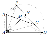 Поскольку MN – средняя линия треугольника BCP, то PN = NC. Значит, AN – высота и медиана треугольника APC, откуда ∠CAM = ∠MAP. Так как BP || AN, то ∠MAP = ∠APB. Наконец, поскольку ∠BPD = ∠BAD = 90°, четырёхугольник ABPD вписан; поэтому ∠APB = ∠ADB. Итак,