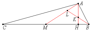 Пусть в треугольнике ABM с углами соответственно 90°, 60° и 30° высота AH и биссектриса BL пересекаются в точке K (см. рис.). Простой подсчёт углов показывает, что в треугольнике ABM сторона AM, высота AH и биссектриса BL образуют красный равносторонний треугольник AKL. Отметив теперь точку C так, чтобы M стала серединой отрезка BC, получим требуемую конструкцию.