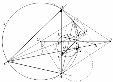 Пусть данные перпендикуляры, проходящие через K и L, пересекают AB в точках U и V соответственно и пересекаются в точке E. Заметим, что обе прямые AC и KE перпендикулярны прямой AC', так что AC || KE; аналогично BC || LE. Пусть прямая C'E вторично пересекает окружность Ω в точке X (см. рис.). Мы докажем, что X – точка касания окружностей ω и Ω. Первый способ. Точки K и L лежат на окружности с диаметром C'E. Поэтому ∠ACX = ∠AC'X = ∠KLE = ∠LCB = ∠MCB. Это значит, что прямая CX – симедиана треугольника ABC; как известно (см. задачу 156983), она проходит через точку S пересечения касательных к Ω в точках A и B.
