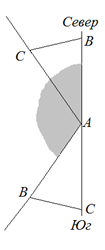 Пусть треугольник упал так, что обход от A к B и далее к C осуществляется против часовой стрелки. Проведём через вершину A прямую, идущую строго с юга на север. Событие "Вершина A восточнее двух других" осуществляется тогда и только тогда, когда вершины B и C расположены в западной полуплоскости от проведённой прямой. На рисунке показаны два крайних положения треугольника, при которых вершины B и C не расположены в восточной полуплоскости. Видно, что луч AB должен проходить внутри закрашенного угла, который является внешним к углу A треугольника. Следовательно, вероятность этого события равна (180 – 40) : 360 = 7/18.