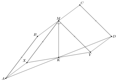 Построим параллелограммы ABMX и DCMY (см. рис.). Так как AX = BM = MC = DY и AX || BC || DY, то AXDY тоже параллелограмм, а K – его центр. Кроме того, MX = AB = CD = MY, следовательно, MK – медиана, а значит, и биссектриса равнобедренного треугольника XMY, что равносильно утверждению задачи.