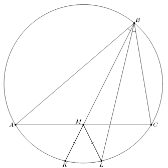 Пусть K – точка пересечения медианы BM и симедианы с описанной окружностью. Так как ∠ABK = ∠CBL, точки K и L равноудалены от точки M стороны AC (см. рис.). Отсюда получаем следующее построение.