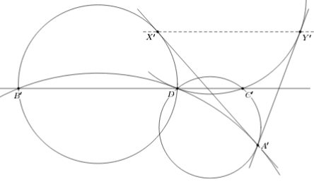 Сделаем инверсию относительно окружности произвольного радиуса с центром в точке D. Образы точек будем обозначать штрихами (см. рис.).