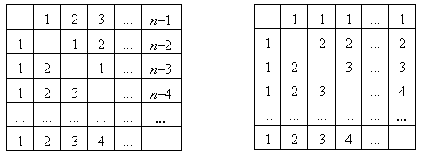 Решение 1: Сумма чисел в k-й строке под диагональю равна 1 + 2 + ... + (k – 1) = ½ k(k – 1). Сумма чисел в k-м столбце над диагональю вдвое больше: она равна (k – 1)k. Поэтому и сумма всех чисел над диагональю вдвое больше суммы под диагональю.