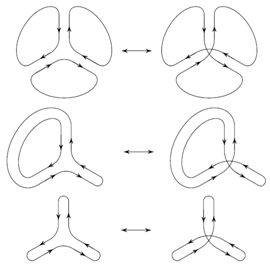 Решение 1: Предположим, что это не так. Тогда на каждом перекрёстке все три раза муравей поворачивает либо только налево, либо только направо. Расположим произвольно левые и правые перекрестки в вершинах додекаэдра и рассмотрим соответствующие маршруты муравья. Получим набор циклов. При замене "знака" одного из перекрёстков происходит перестройка: если к перекрёстку подходит три цикла, они склеиваются в один, если два – они переклеиваются в два другие, если один – остаётся один или он распадается на три (см. рисунки).