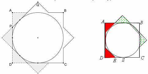 Рассмотрим круг диаметра 1 и объединение двух описанных вокруг него квадратов, отличающихся поворотом на 45°. Получится восьмиконечная звезда. Откинем от неё четыре серых треугольника (рис. слева). Круг лежит в оставшейся белой фигуре и касается её границы только в четырёх точках. Немного сдвинем круг вправо. Сдвинутый круг останется в фигуре и будет касаться только её стороны CE в точке S. Это останется верным и после небольшого увеличения сдвинутого круга гомотетией с центром в S.