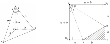 Рассмотрим квадрат СD1TD2 со стороной a + b и отложим на его сторонах TD1 и TD2 отрезки TA = b и TB = a соответственно (рис. справа). Тогда пятиугольник ABD2CD1 является развёрткой боковой поверхности данной пирамиды, а треугольник ATB равен треугольнику ADB её основания. Таким образом, выполняются все условия задачи, значит, α + β + γ = 90°.